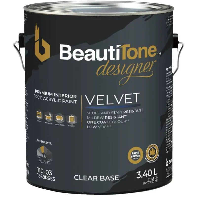 Beautitone Designer Interior Acrylic Latex Velvet Paint & Primer - Clear Base, 3.4 L