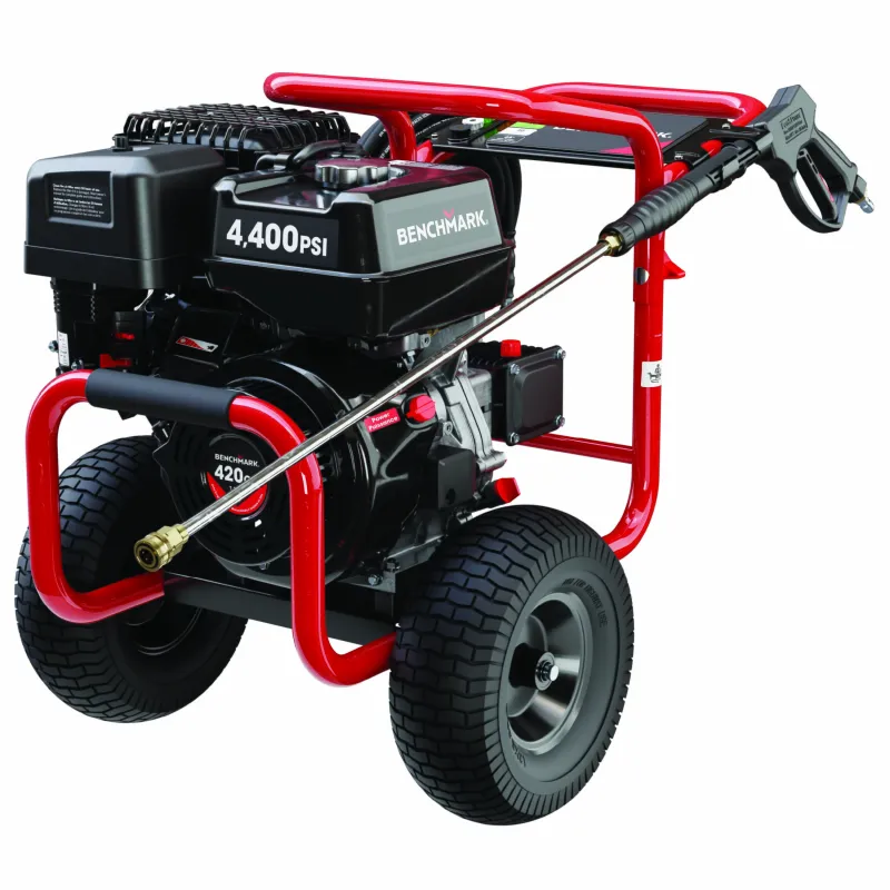 Benchmark’s 4400 PSI gas pressure washer is a completely dominating washing and stripping system that gets you through garage, walkways, siding, paint projects and spring deck cleaning fast and easy. Outputs 4.0 gallons per minute from the spray wand, making it easy, fast and satisfying to clean your mouldy deck. The onboard tray keeps your (5) quick-connect nozzles ready to change quickly, while the detergent injector helps lather up and cut through dirt and grime on more delicate surfaces. Don’t strain to reach those awkward spots up the ladder, with the 30' rubber quick-connect hose, 31" wand and industrial wheels, this pressure washer rolls with you wherever it’s needed.
