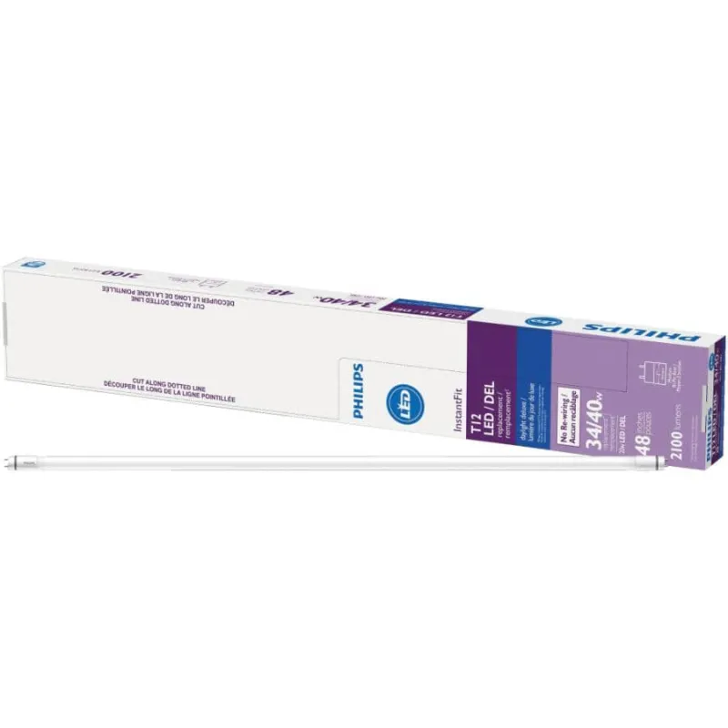 Philips InstantFit LED tubes easily replace fluorescent T12 tubes operated on rapid-start magnetic ballasts, no rewiring needed. This glass LED linear bulb looks and feels like fluorescent and has a daylight effect and long lifetime.
